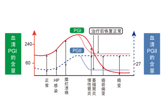 PGI、PGII、PGI和PGII比值的異常會提示不同的胃病,PG是淺表性胃炎、糜爛性胃炎、胃潰瘍、十二指腸潰瘍、萎縮性胃炎、胃癌等胃部疾病的初篩選指標和治療的監(jiān)控指標。PGI/II比值進行性降低與胃粘膜萎縮進展相關。因此,聯(lián)合測定PGI和PGII比值可起到胃底腺粘膜“血清學活檢”的作用。