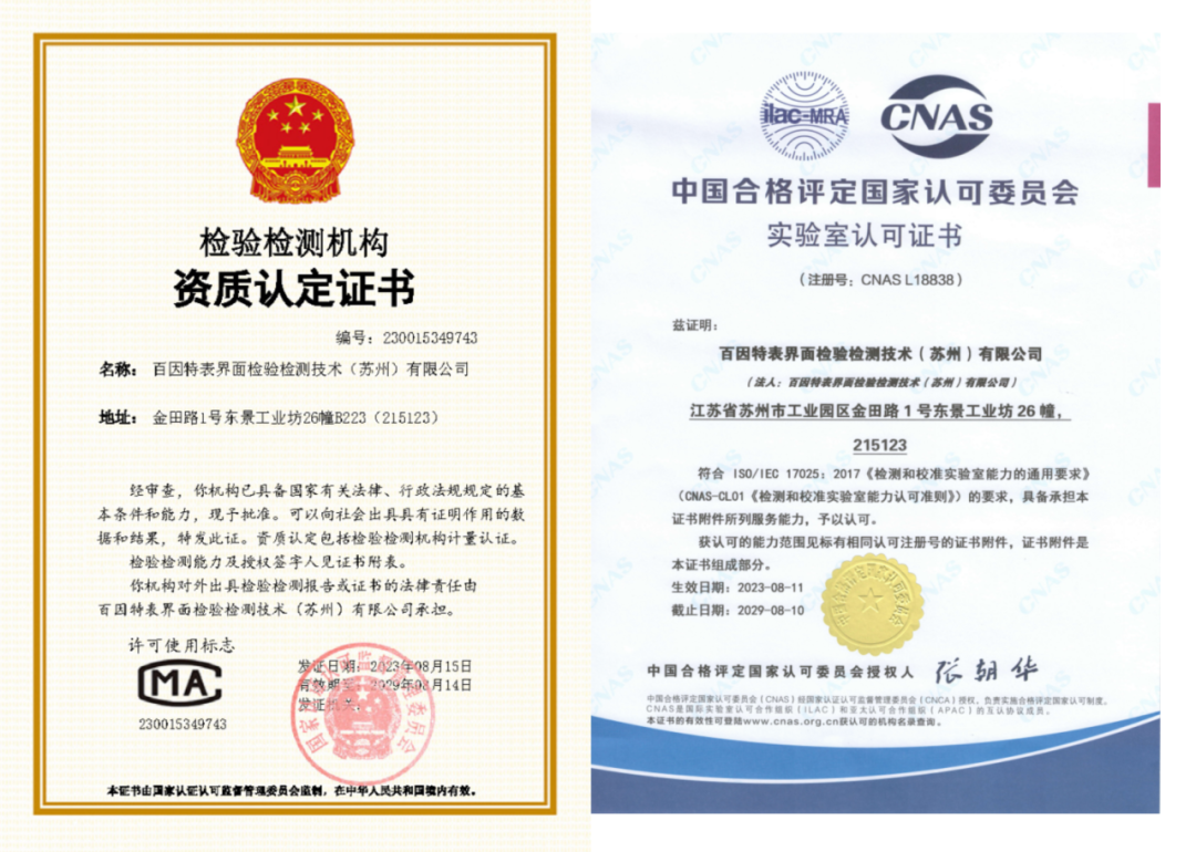 近日,百賽飛旗下百因特表界面檢驗(yàn)檢測(cè)技術(shù)(蘇州)有限公司正式獲得中國(guó)合格評(píng)定國(guó)家認(rèn)可委員會(huì)(CNAS)實(shí)驗(yàn)室認(rèn)可證書(shū)(注冊(cè)號(hào):CNAS L 18838)及檢驗(yàn)檢測(cè)機(jī)構(gòu)資質(zhì)認(rèn)定(CMA)證書(shū)(編號(hào):230015349743),成為了同時(shí)擁有CNAS和CMA權(quán)威認(rèn)證的獨(dú)立第三方醫(yī)療器械檢驗(yàn)檢測(cè)機(jī)構(gòu)。