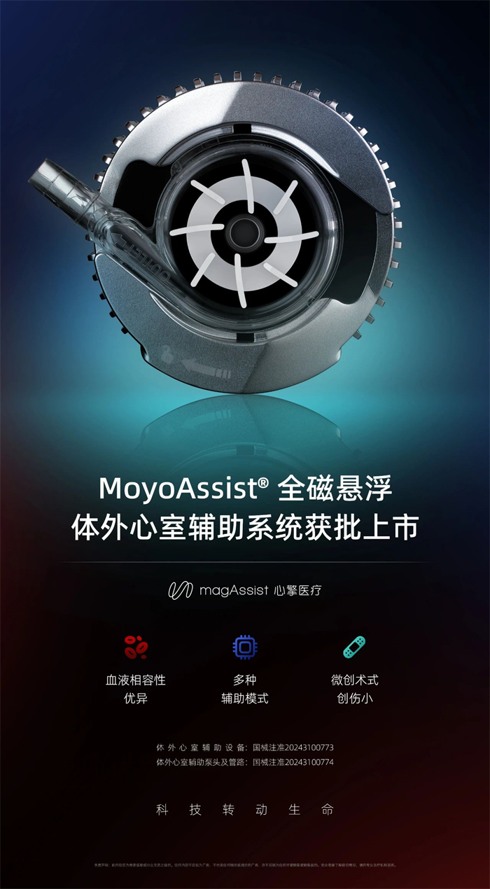 值得一提的是,MoyoAssist®是國內(nèi)首個(gè)擁有全磁懸浮技術(shù)的體外心室輔助設(shè)備及專用耗材,本次獲批上市代表國產(chǎn)高端醫(yī)療器械的又一新突破。