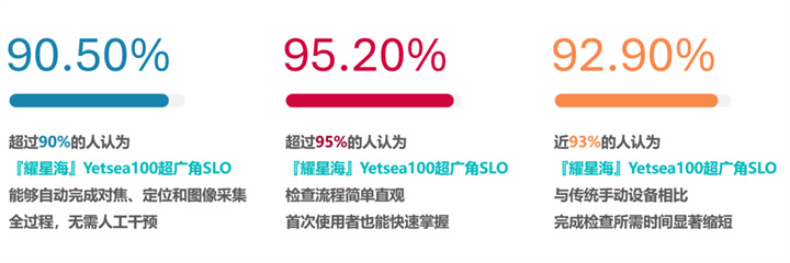 針對(duì)體驗(yàn)者進(jìn)行的『耀星海』Yetsea100超廣角SLO自動(dòng)掃描調(diào)查問(wèn)卷顯示,有超過(guò)90%的人認(rèn)為與傳統(tǒng)手動(dòng)設(shè)備相比,『耀星海』Yetsea100超廣角SLO完成檢查所需時(shí)間顯著縮短,且學(xué)習(xí)曲線短,極易上手。