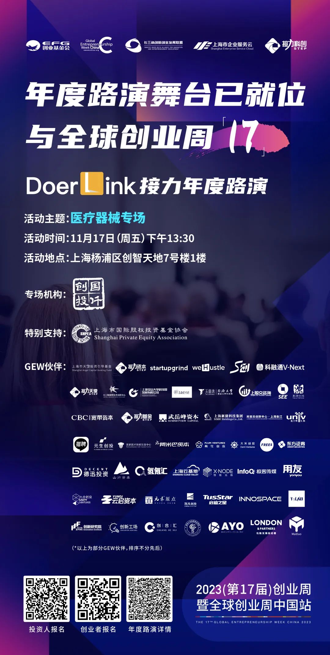 為助力醫(yī)療器械領域科技創(chuàng)新項目高質量發(fā)展,推動科技資源、優(yōu)質企業(yè)、投資機構與產業(yè)集群的深度協同與合作,2023(第17屆)全球創(chuàng)業(yè)周中國站、上海市中小企業(yè)服務中心將攜手國仟創(chuàng)投、上海國際股權投資基金協會,共同舉辦DoerLink接力年度路演—醫(yī)療器械專場。本期路演將邀請6家科技創(chuàng)新企業(yè)及項目、20+專業(yè)投資人、高效開展投融資對接、高校成果轉化交流路演。