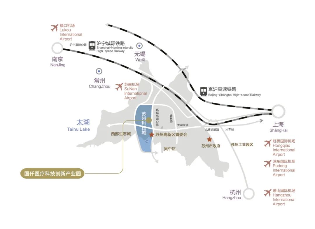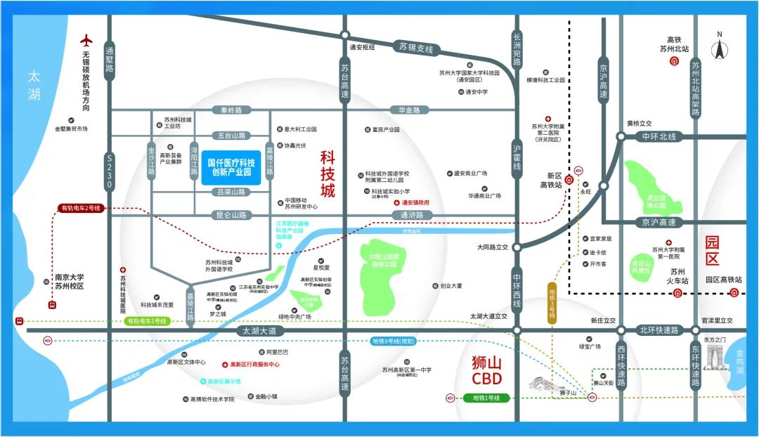 距離蘇州新區(qū)火車站約6公里、蘇州站約14公里、高鐵北站約18公里