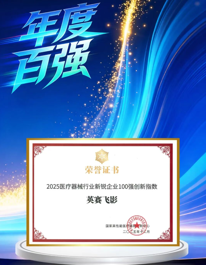 歷經(jīng)三個多月的征集、遴選與業(yè)內(nèi)資深專家的多輪嚴(yán)謹(jǐn)評審,英賽飛影憑借自研無線核心技術(shù)突破、全場景產(chǎn)業(yè)協(xié)同及高臨床價值落地,連續(xù)兩年榮登年度百強,繼續(xù)上榜“2025醫(yī)療器械行業(yè)新銳企業(yè)100強創(chuàng)新指數(shù)”。