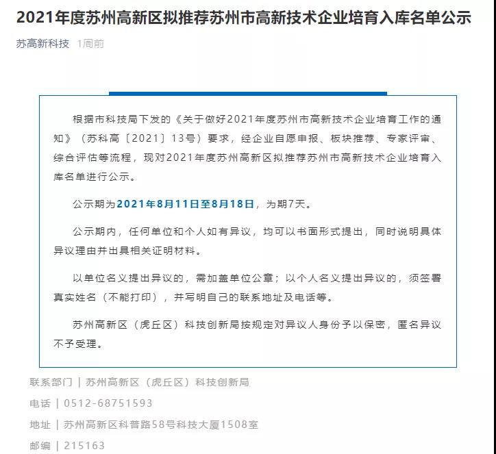 根據(jù)市科技局下發(fā)的《關(guān)于做好2021年度蘇州市高新技術(shù)企業(yè)培育工作的通知》(蘇科高〔2021〕13號(hào))要求,經(jīng)企業(yè)自愿申報(bào)、板塊推薦、專家評(píng)審、綜合評(píng)估等流程,現(xiàn)對(duì)2021年度蘇州高新區(qū)擬推薦蘇州市高新技術(shù)企業(yè)培育入庫名單進(jìn)行公示。