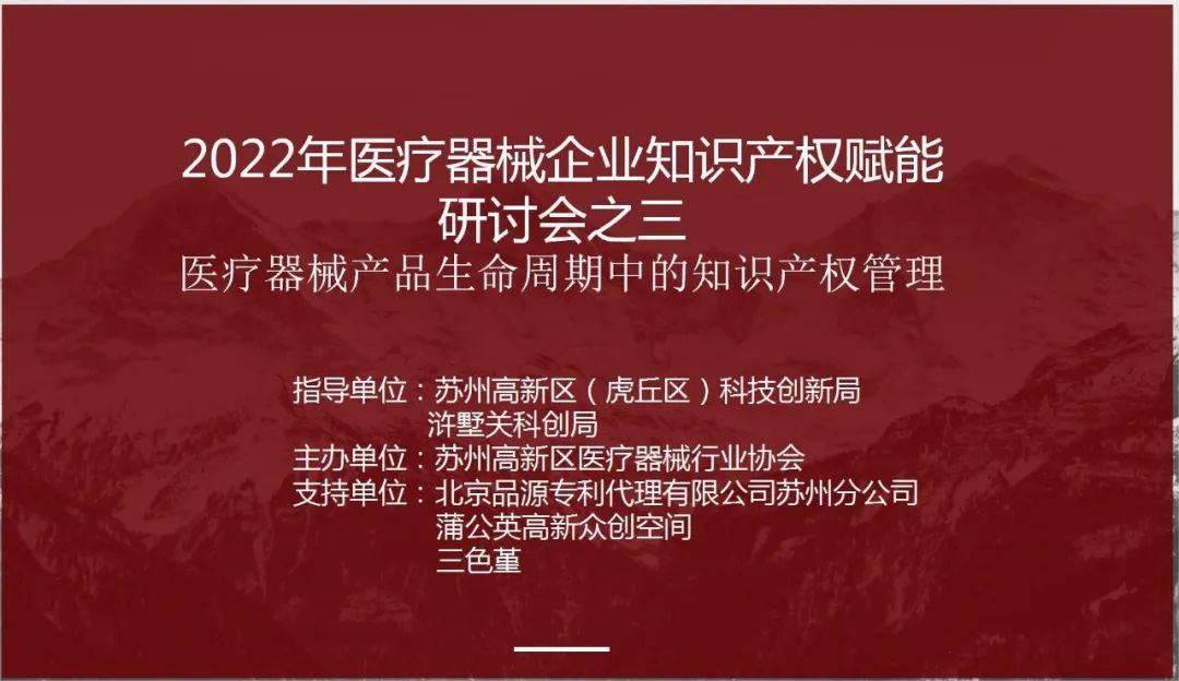 2022年11月22日,由蘇州高新區(qū)(虎丘區(qū))科技創(chuàng)新局、滸墅關(guān)科創(chuàng)局指導(dǎo),在北京品源專利代理有限公司蘇州分公司、蒲公英高新眾創(chuàng)空間、三色堇的支持下,蘇州高新區(qū)醫(yī)療器械行業(yè)協(xié)會(huì)舉辦醫(yī)療器械企業(yè)知識(shí)產(chǎn)權(quán)賦能“產(chǎn)品生命周期中的知識(shí)產(chǎn)權(quán)管理”研討會(huì)。